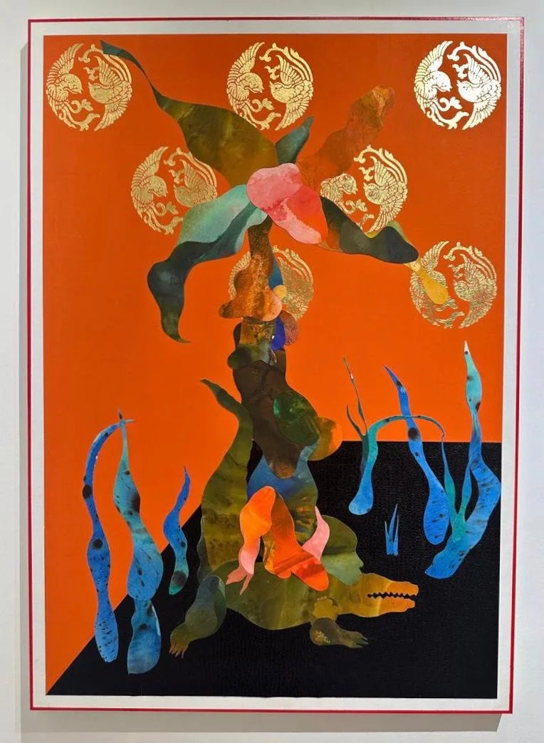 Ethiopien au Crocodile, 2024, Wood panel, Material: Sumi, japanese pigment on washi, (japanese paper), Technique: Collage and painting, 70cm x 100cm